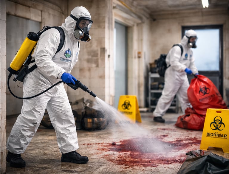 Certified biohazard cleanup after traumatic events. We safely remove blood, bodily fluids, and contaminated materials while fully disinfecting and restoring the affected area. Our team works discreetly and follows OSHA safety standards.